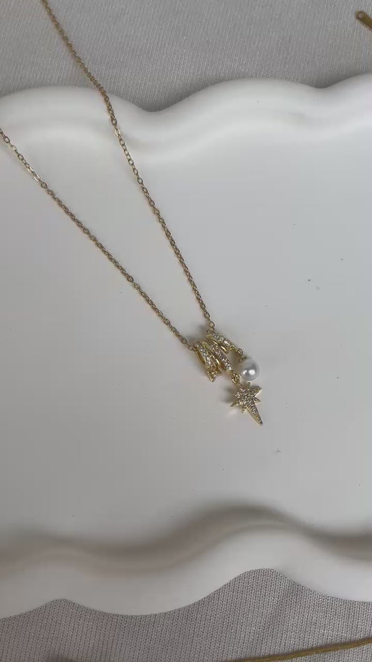 ASC Taşlı Kuzey Yıldızı İnci Detaylı Gold Kolye