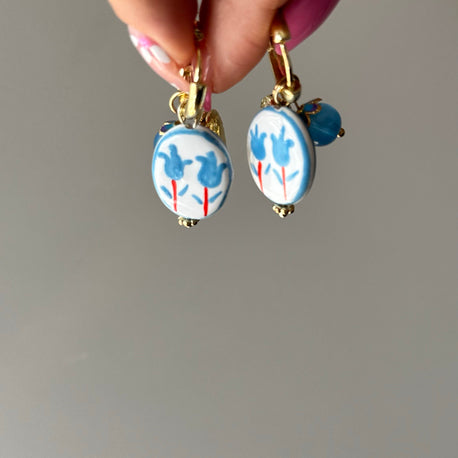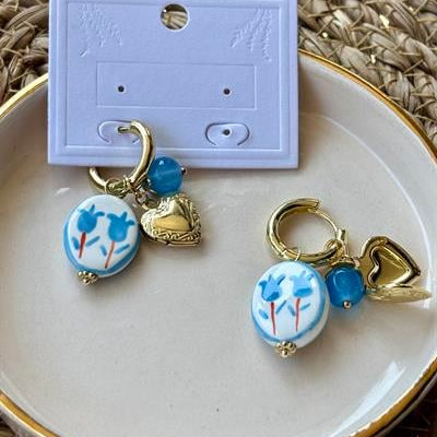 Mavi Çiçek Desenli Charmlı Kalp Detaylı Küpe